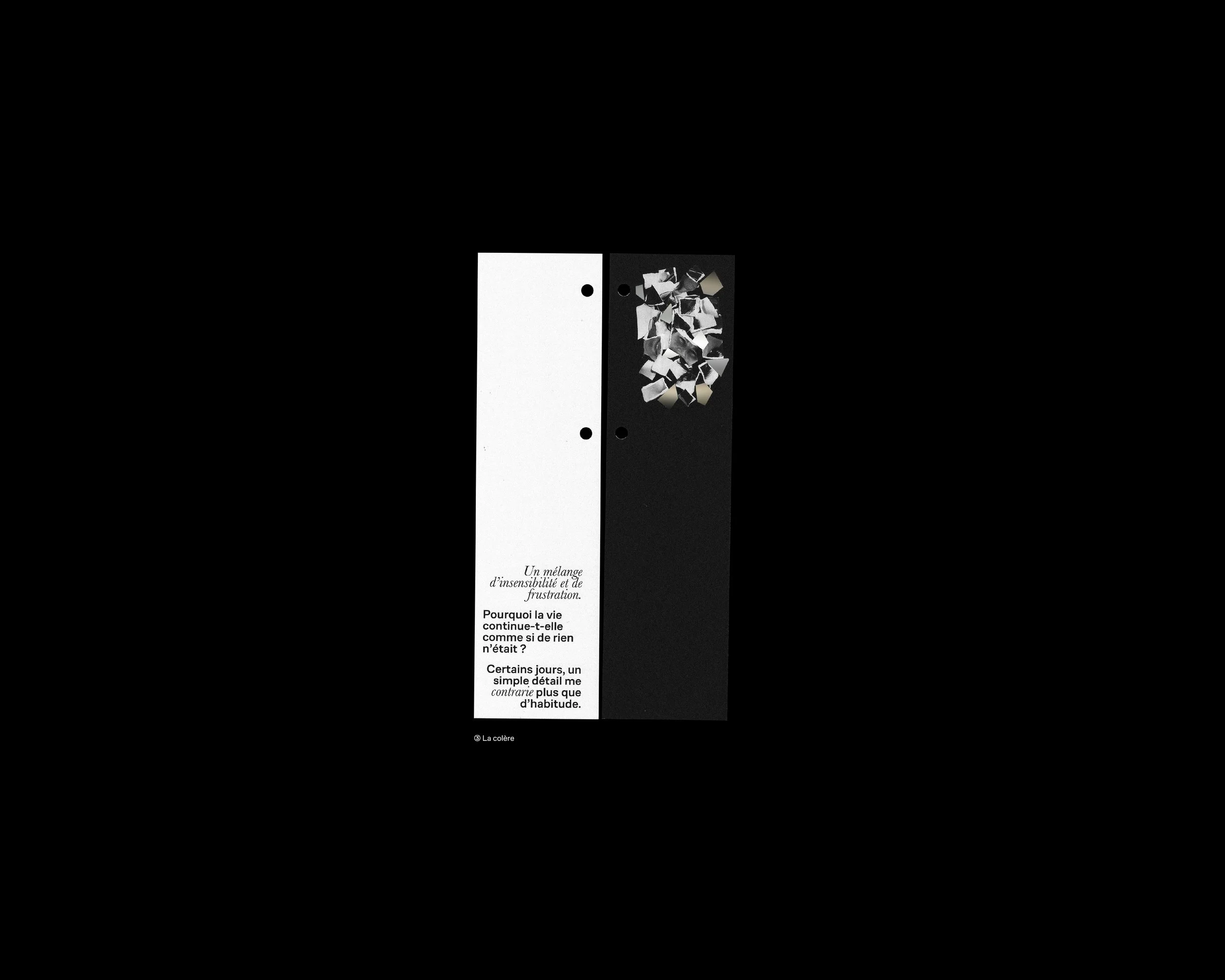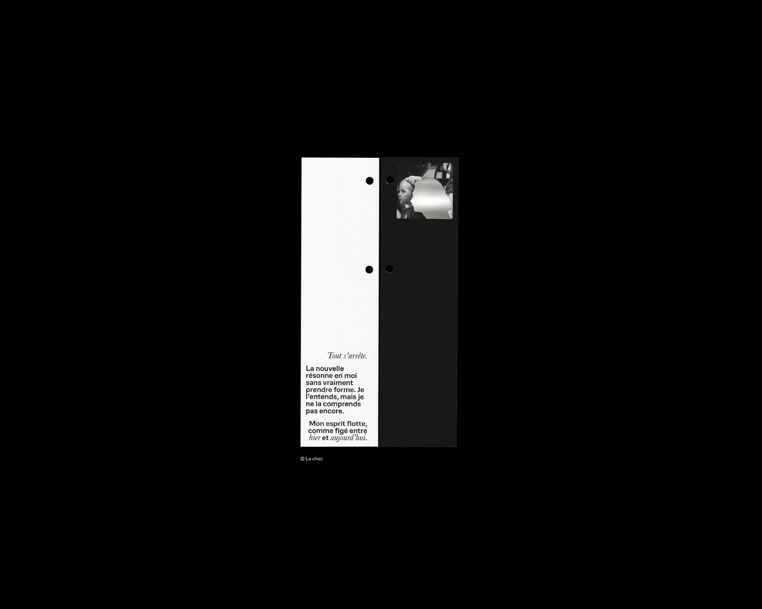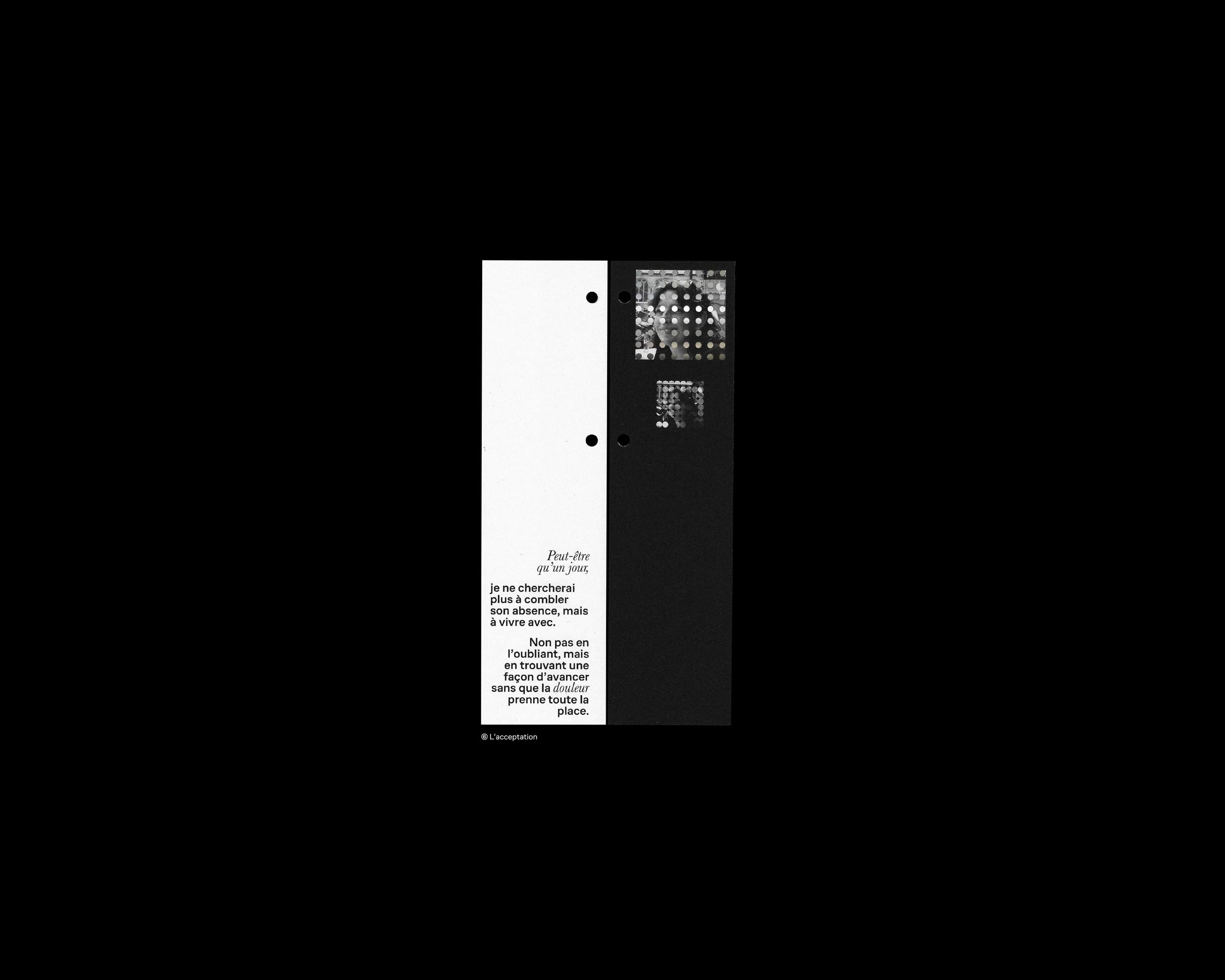 An intimate and graphic publishing project on grief. Through the seven stages of grief—shock, denial, anger, sadness, resignation, acceptance, and reconstruction—this book recounts how photography, when it becomes material again, can accompany loss and memory.